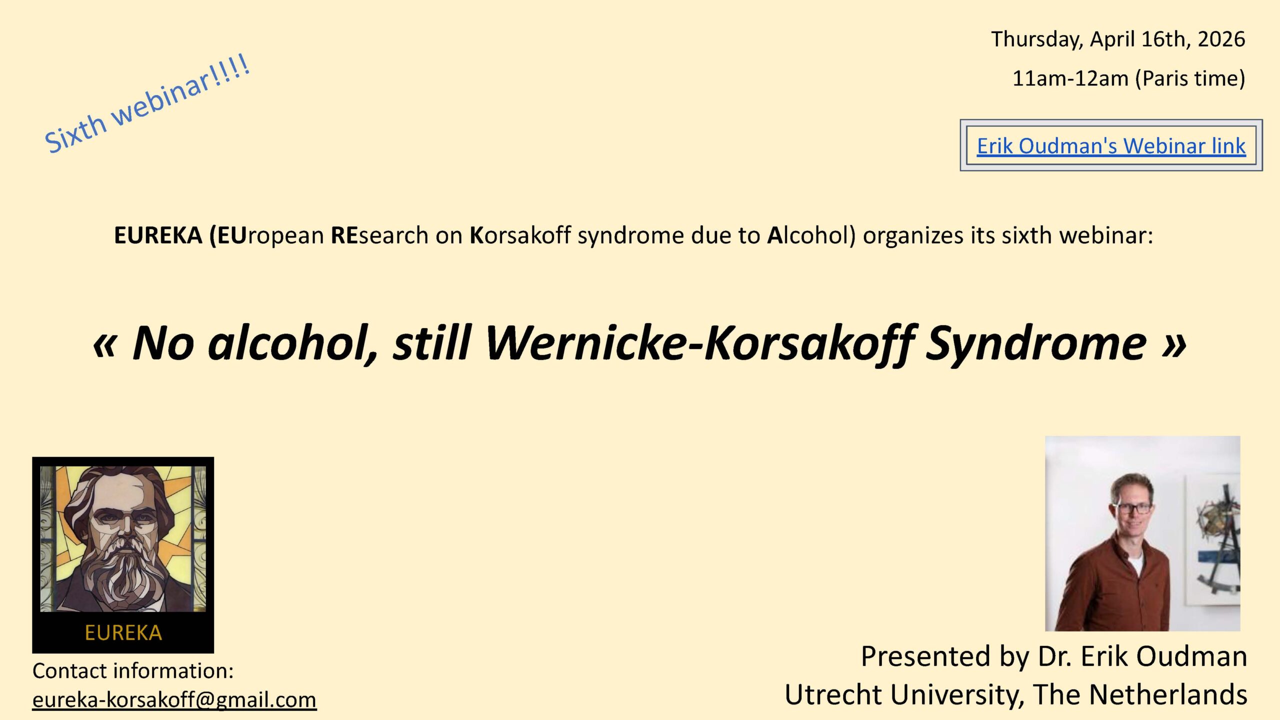 Sixième Webinaire sur le syndrome de Korsakoff organisé par le groupe EUREKA (EUropean REsearch on Korsakoff syndrome due to Alcohol) Date le 16 avril 2026 de