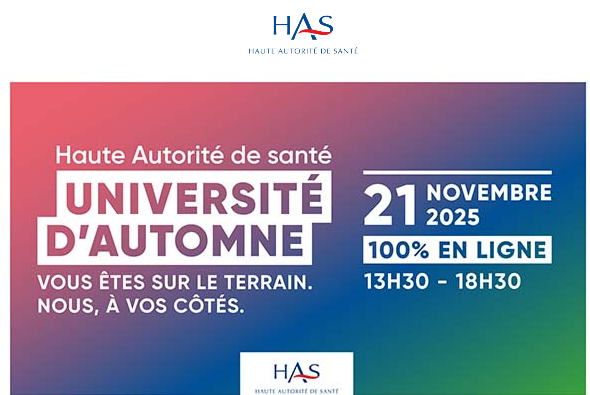 La Haute Autorité de santé (HAS) vous donne rendez-vous vendredi 21 novembre, de 13h30 à 18h30, pour sa première université d’automne : une demi-journée pensée pour vous, étudiants et professionnels du sanitaire, social et médico-social.