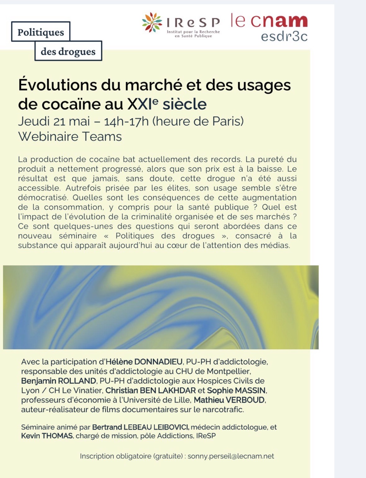 Save the date ! Jeudi 21 mai à 14h, webinaire Teams Politiques des drogues, organisé par l’Equipe Sécurité Défense – Renseignement, Criminologie, Crises, Cybermenaces (ESDR3C) et l’IReSP – Institut pour la Recherche en Santé Publique :