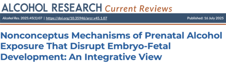 Référence : Fleming TP, Baschat A, Hardy DB, Parnell SE, Ramadoss J, Smith SM. Nonconceptus Mechanisms of Prenatal Alcohol Exposure That Disrupt Embryo-Fetal Development: An Integrative View. Alcohol Res. 2025;45(1):07. doi:10.35946/arcr.v45.1.07. Published 12 June 2025. PMID: 40581001.